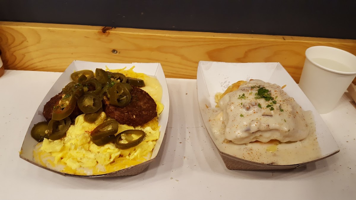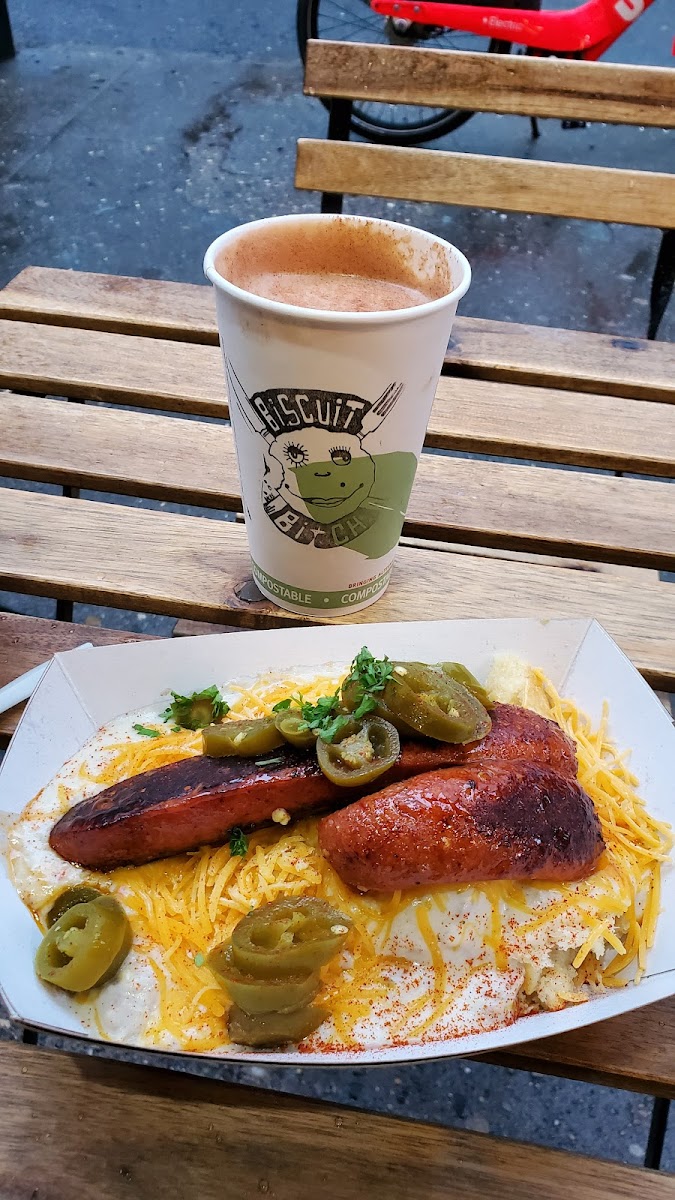 No dine in, only carry out. The system is pretty easy to understand. Walk up, order and pay, they have an estimate of how long it’ll take, set a timer on your phone and go walk around until it’s time. That’s what we did and the exact moment our timer went off, they brought our food out. We had the bacon and the hot links biscuits. I’m from TX so when they said these are southern style, I was a little skeptical. But these were really delicious biscuits, I was impressed! And they’re big! It doesn’t really look like it from the pictures online but I was worried it wouldn’t be enough to fill me up - it definitely was.